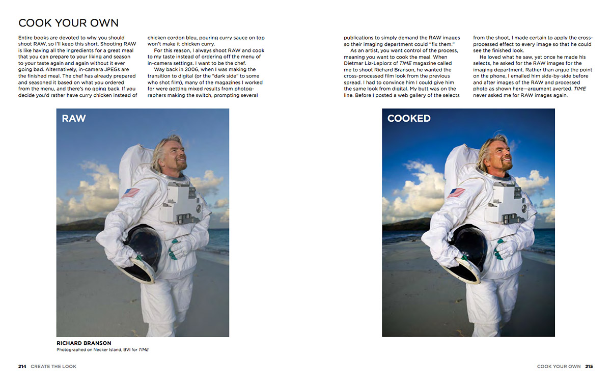 He covers the importance of location, subject interaction, lighting (in detail, with its own section), format choices and even Photoshop. I was pleasantly surprised to see him include info on his wide-ranging post production, even going as far as to show several examples of straight-out-of-camera images right next to the finals: