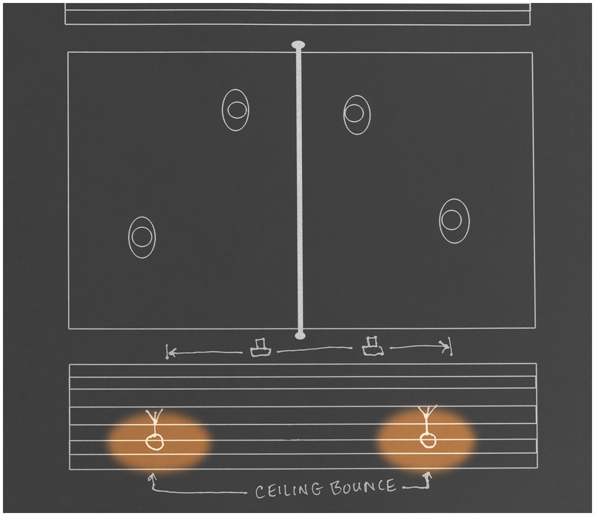 So instead "skim" them across the ceiling, aiming them high and diagonally across the court. By using tele-reflectors, which have narrow beams, you'll direct most of the energy away form the near court and you can get gorgeous, totally even lighting wherein everyone anywhere on the court is key lit, filled and rimmed.