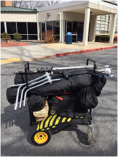 Among that pile of stuff on the Rock n' Roller cart is three Einstein 640 monoblocs and a total of four soft light sources. (Two 30x60" soft boxes and two ~1x3' strips.)