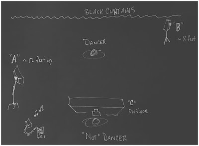 The key light is 30x60" soft box (by Paul Buff, here) about 20 feet up and over to camera left. It is denoted as "A" on the diagram. It is racked up as high as I can get it with a (heavily sandbagged) C-Stand.
