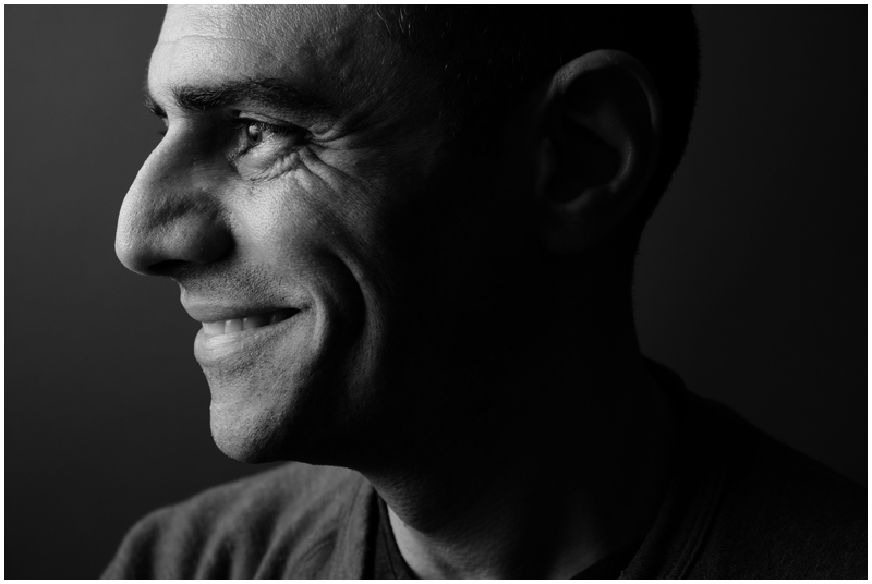 Let's bring our light around to camera left (Tarek's right) for a moody profile shot. If you have changed your distance, you'll have to readjust your flash power to get a proper exposure. Or even if you have not changed your distance, you'll often find lighting a person in profile is somehow more efficient (light skims off of them very efficiently) and you have to drop your flash exposure anyway.