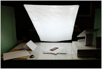But even so, you can get a lot of the way there on a shoestring budget (one speedlight, a cheap soft box, and A4 paper for both fill cards and our "white seamless" background.)